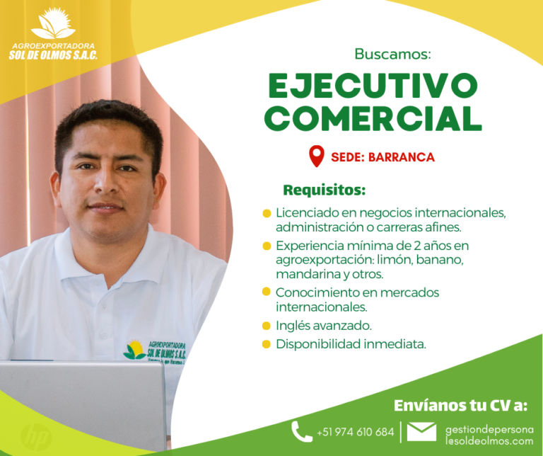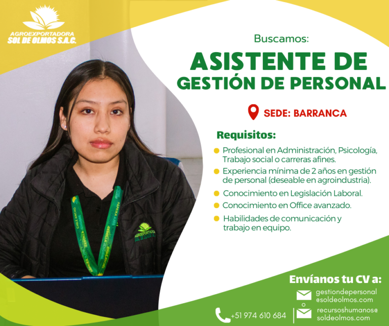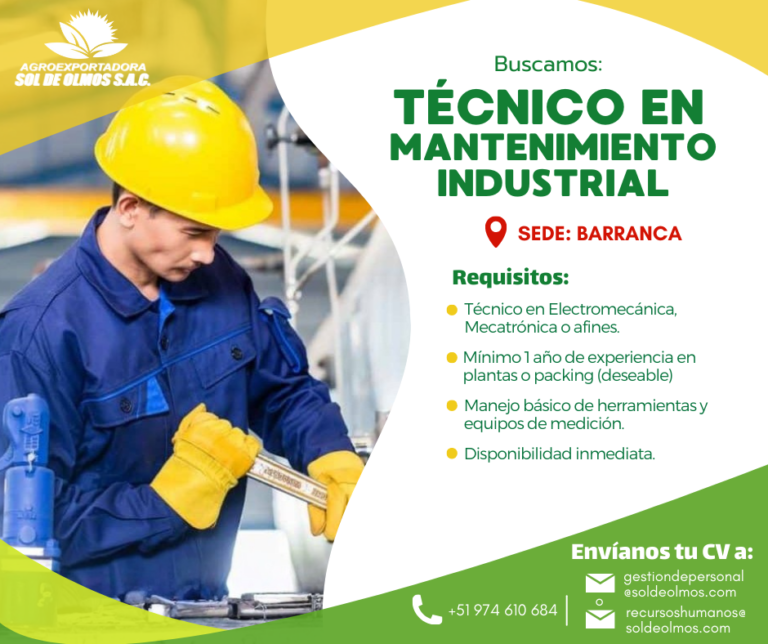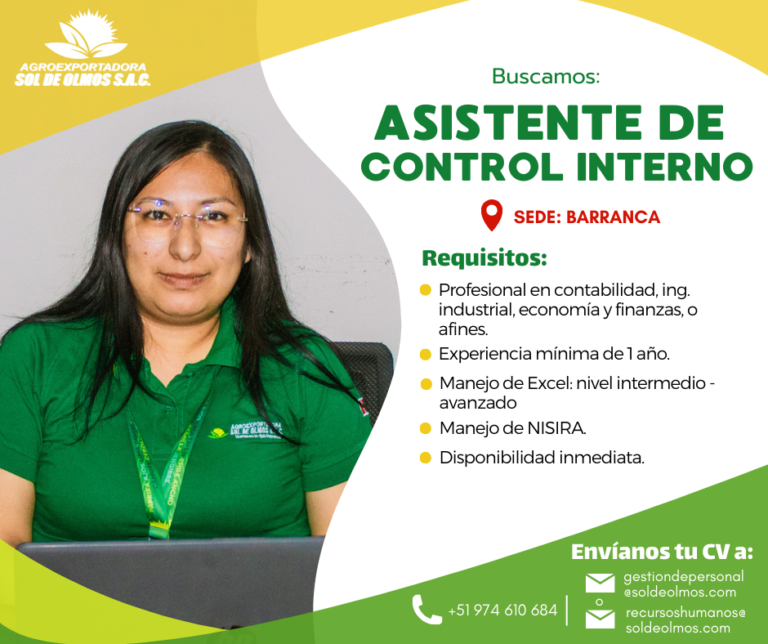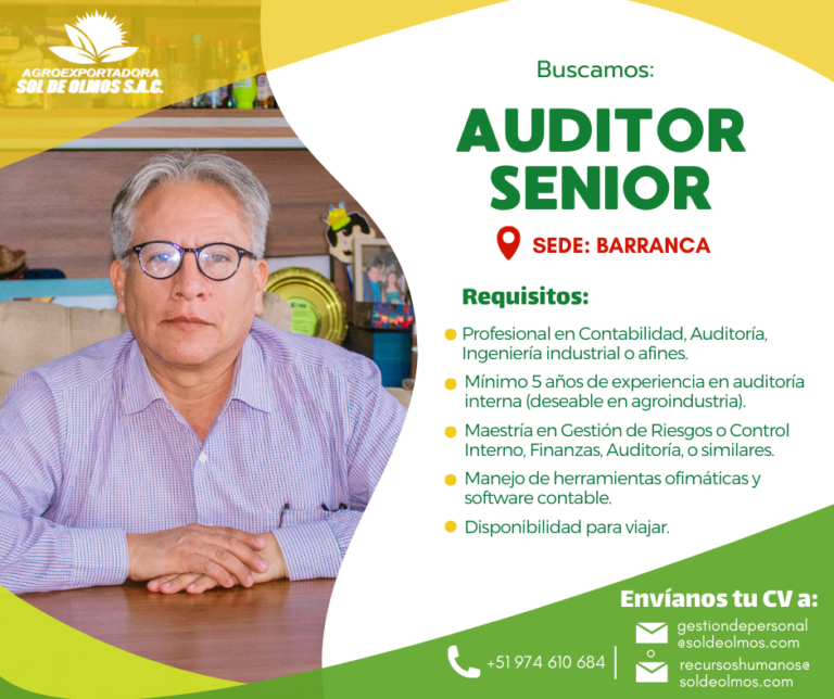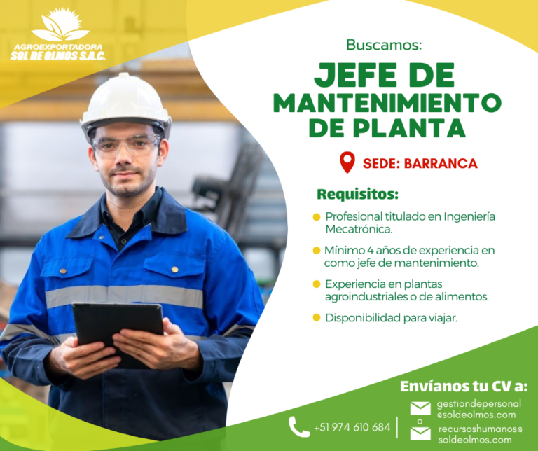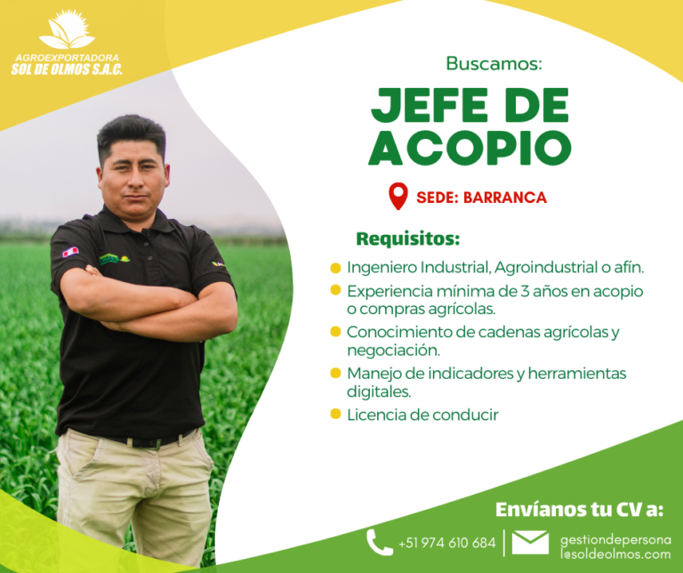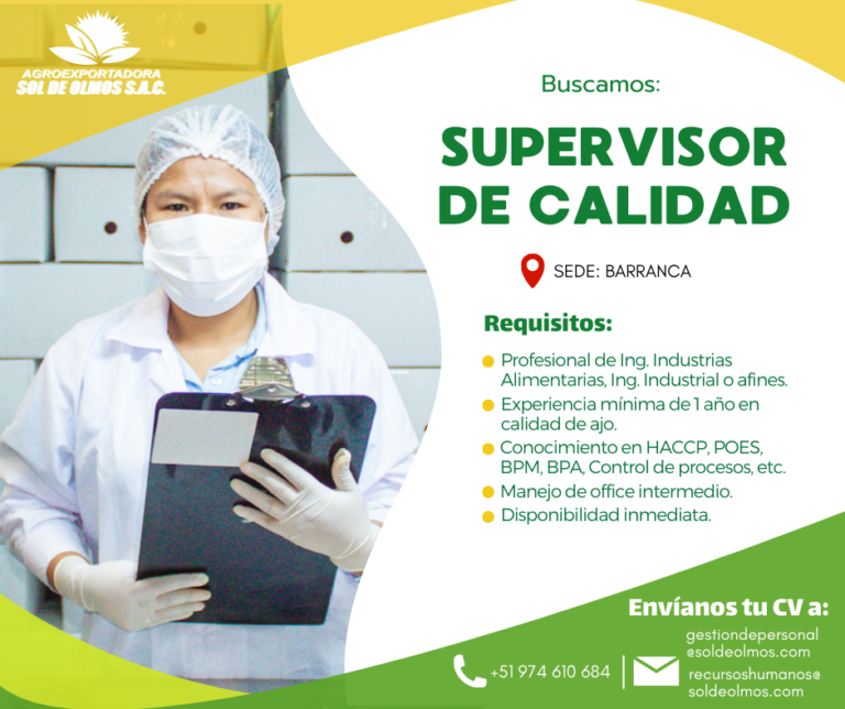 Requisitos: Profesional en Ingeniería Agroindustrial, Industrias Alimentarias, Agronomía o carreras afines. Experiencia mínima de 1 año en áreas de calidad en empresas agroexportadoras. Conocimiento sólido en normas y certificaciones internacionales (Global G.A.P., HACCP, BRC, ISO, etc.). Idiomas inglés básico-Intermedio. Manejo…